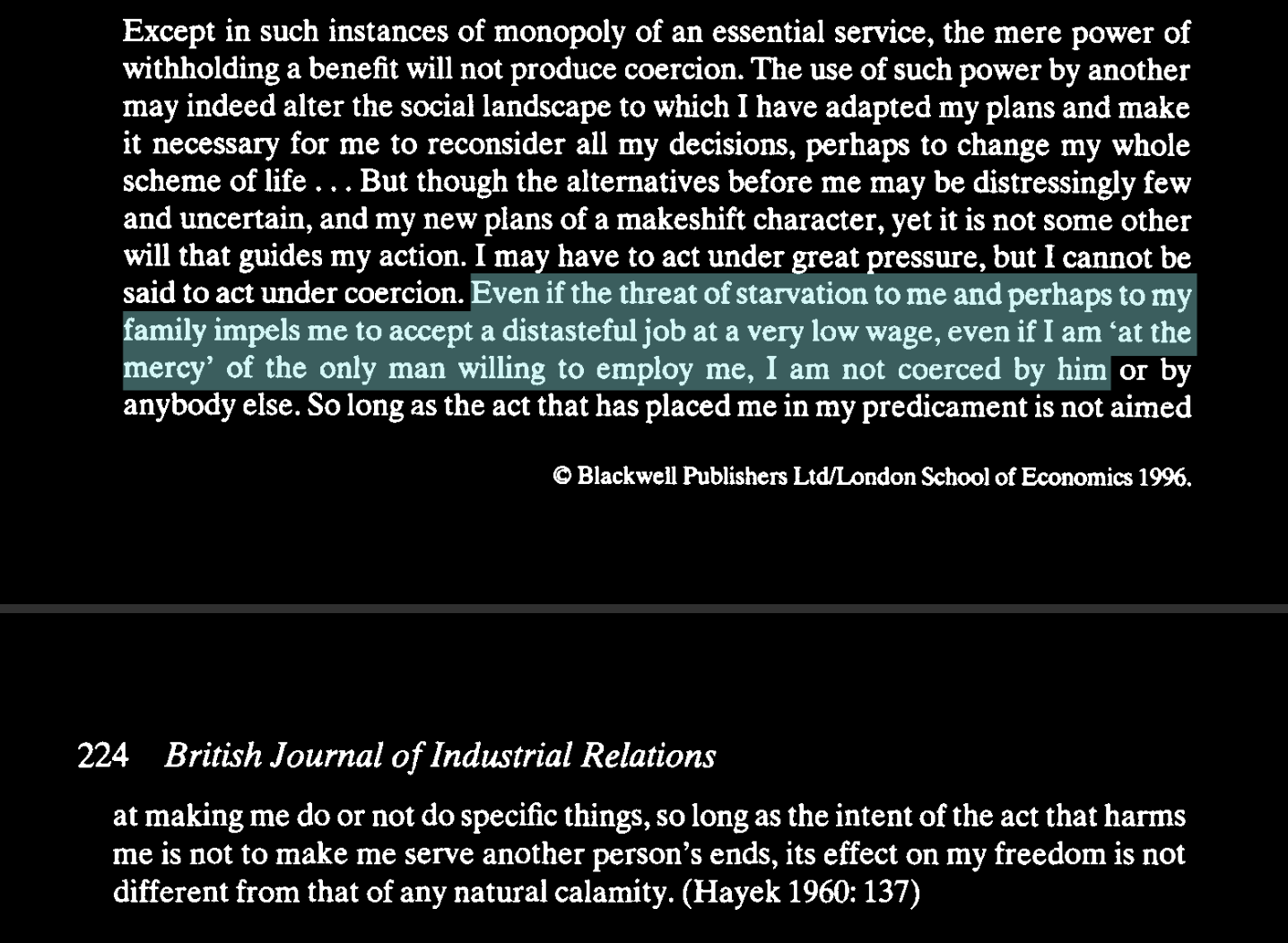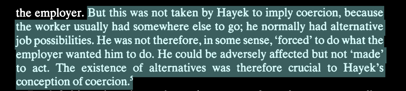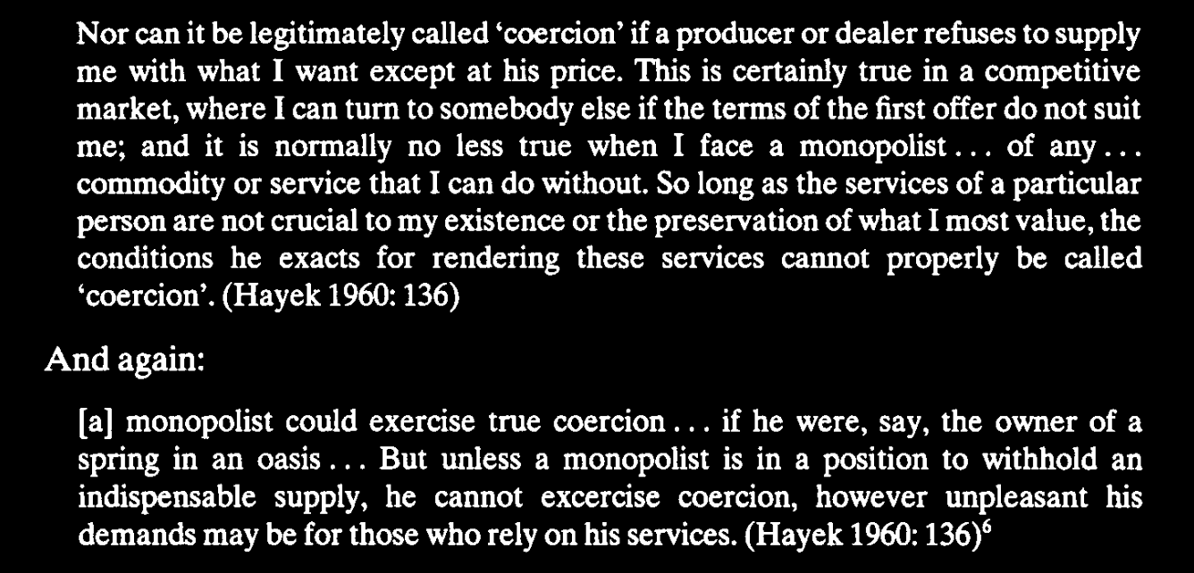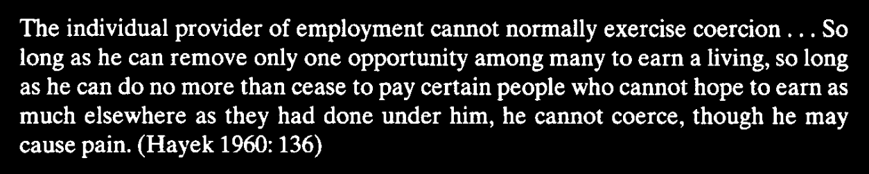 To Hayek, not only normal employers but even monopolist employers could not be coercive unless their service was as vital as a “spring in an oasis.”